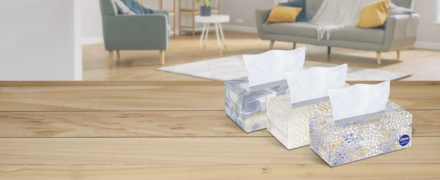Our Expressions tissue boxes feature soft watercolor textures and cool tones.