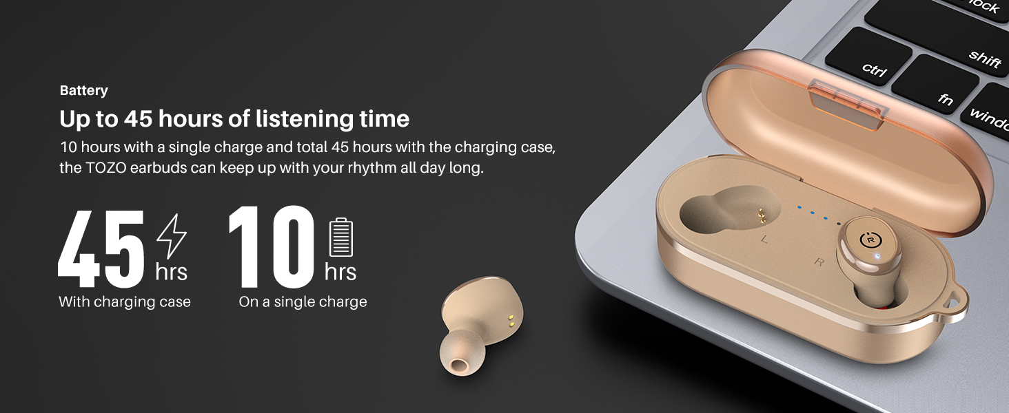 Stereo Sound Quality TOZO T10 Earbuds’ 8mm large size speaker driver (the drive area is 1.77 times than the normal drive area) delivers powerful bass( lowest 16Hz). mellow midrange. and clear treble(up to 20kHz). Reproducing your music vividly.Bluetooth 5.3 Features with the advanced Bluetooth 5.3 technology. TOZO T10 Earbuds support HSP HFP A2DP AVRCP. which provides instant pairing and stable transmission without interruptions.One Step Pairing Simply take 2 headsets out from the charging case. and they will connect each other automatically and then only one step easily enter mobile phone Bluetooth setting to pair the earbuds.IPX8 Waterproof Earbuds and charging case inner Nano-coating makes it possible to waterproof for 1 meters deep for 30 minutes. Waterproof and sweatproof latest technology can effectively prevent from the damage of the splash by sweat and raindrops.Charge on the Go Playtime lasts for over 10 hours from single charge and total 45 hours with charging case. Enjoy fast charging. to fully charge the rechargerable case only 1.5 hours via fast charge USB-C cable or less than 2 hours via wireless charger. Providing convenient charging way with no strings attached.
