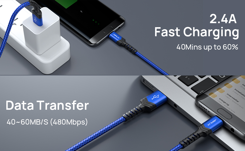 【High Speed Charging and Sync】: Micro USB Cable transfer speed up to 480Mbps. 2.4A Charge. Data transfer and high speed charging 2 in 1.